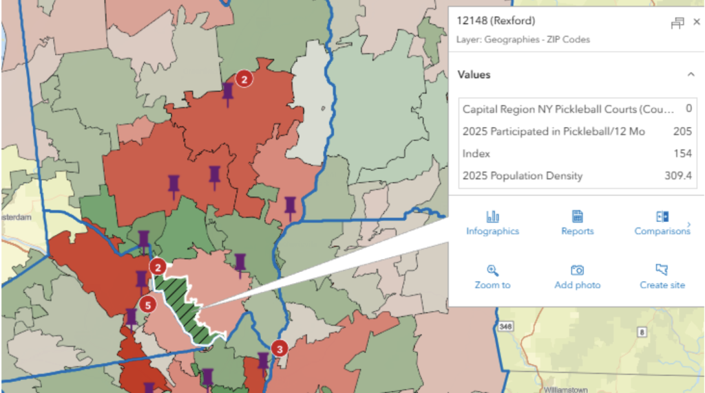 Neighboring ZIP codes to the east and west show up red on the suitability map, indicating lower scores. This is partly due to proximity but also reflects lower interest in pickleball in those areas. In contrast, Rexford scores quite high on the Pickleball Market Potential Index (MPI), with a value of 154—strong validation of its high Suitability Score. Even though it’s relatively close to other courts, they’re far enough away to preserve market potential.