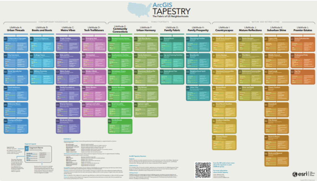 If you’re familiar with marketing “personas,” Tapestry profiles are similar—but much more detailed. Using up-to-date Census data, government datasets, and ESRI’s proprietary models, the U.S. population is segmented into one of 60 unique profiles, grouped into 12 broader LifeModes based on lifestyle and life stage.