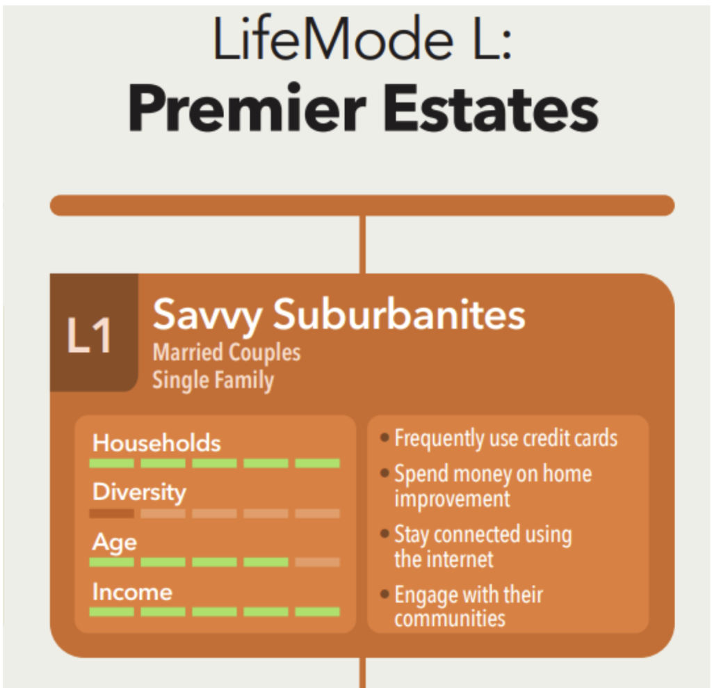 Savvy Suburbanites come from LifeMode L, known as Premier Estates. These are typically well-to-do households with some of the highest levels of income, wealth, and educational attainment in the country. Not a bad audience to market to.