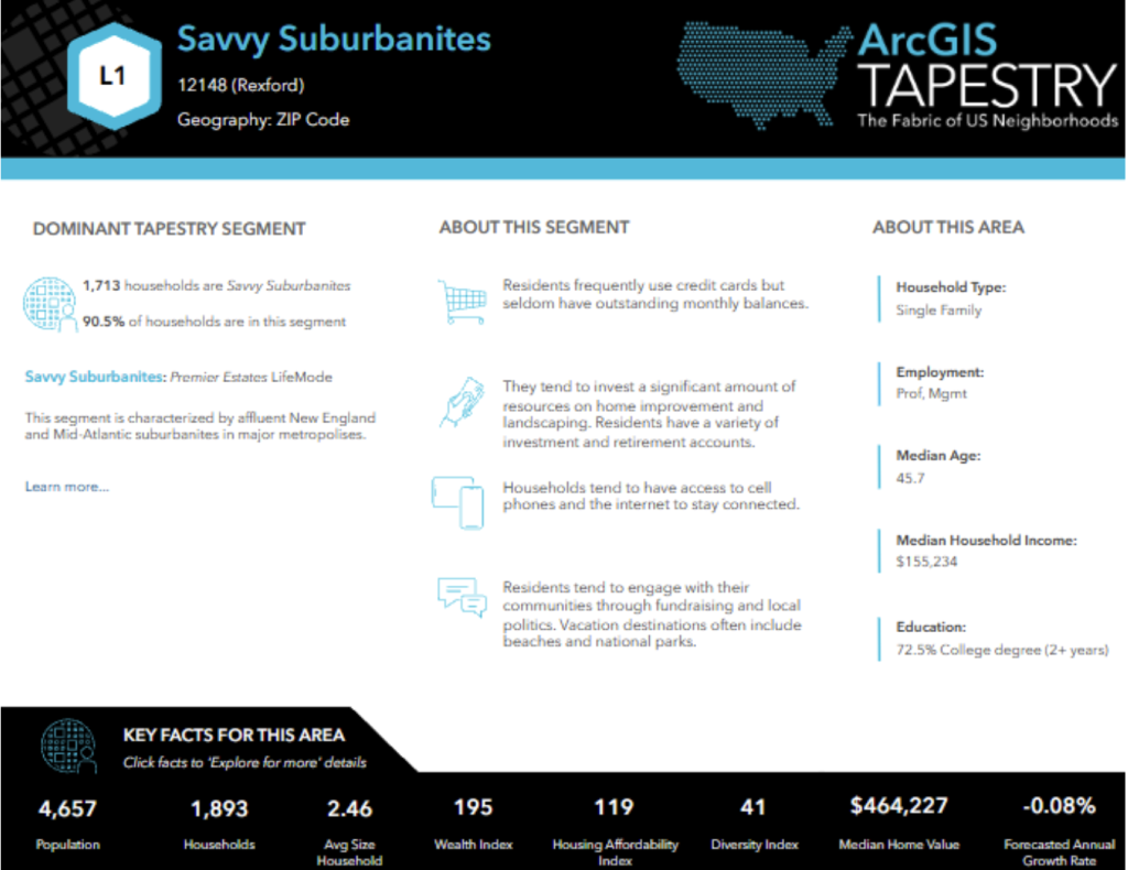 With Rexford selected, we wanted to learn more about the people who live there before fully committing. Fortunately, ESRI’s proprietary Tapestry Segmentation tool lets us dive deep into demographics and psychographics.
