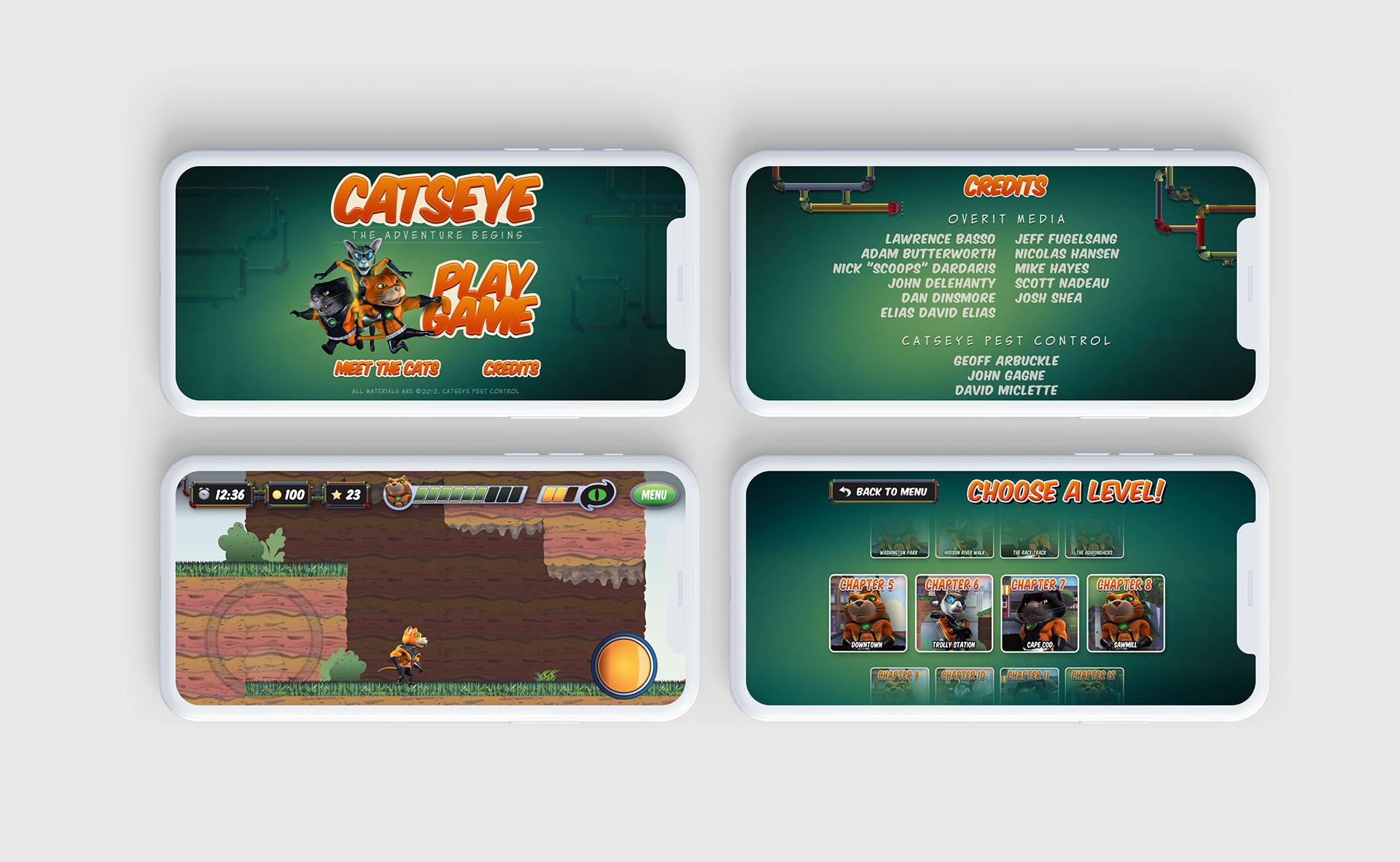 The mobile game and cartoon were standout marketing pieces for Catseye and were used to develop the characters, their story and to build general brand awareness. The game was created using 2D artwork drawn in Adobe Illustrator for the backgrounds and pre-rendered animation sprites of the characters from their 3D models. The game was built in Corona’s game engine.