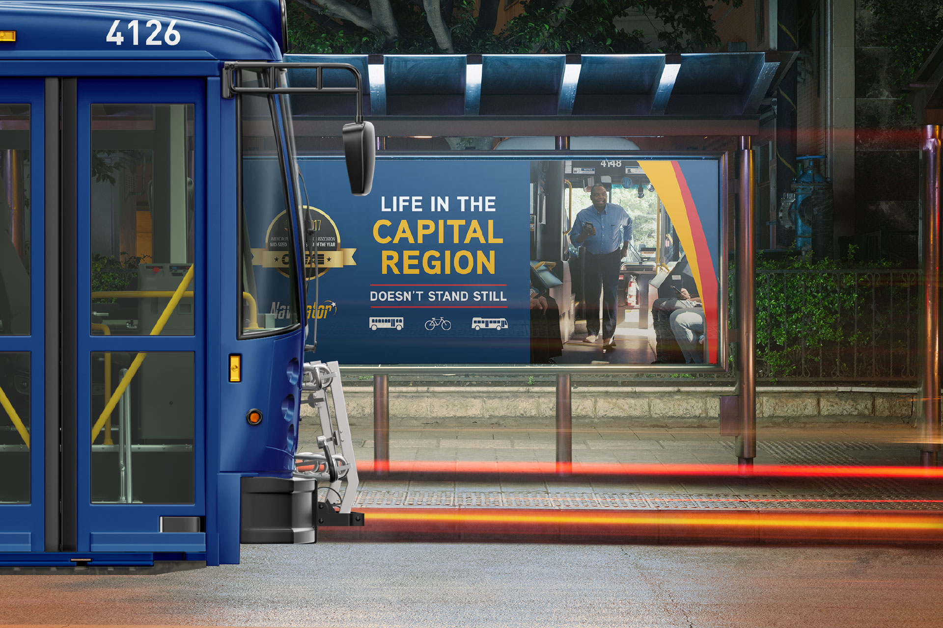 Catapulted by CDTA’s many successes, the brand was named the Best Mid-Size Transportation System in North America by the American Public Transportation Association (APTA) in 2017. To help the region celebrate, Overit went to work. This included the creation of a CDTA/APTA award logo, various marketing collateral pieces (including banners, posters, billboard, and bus signage), livestreaming of CDTA’s internal company announcement, and acting as press and promoters at the company’s pep rally-themed public announcement.
