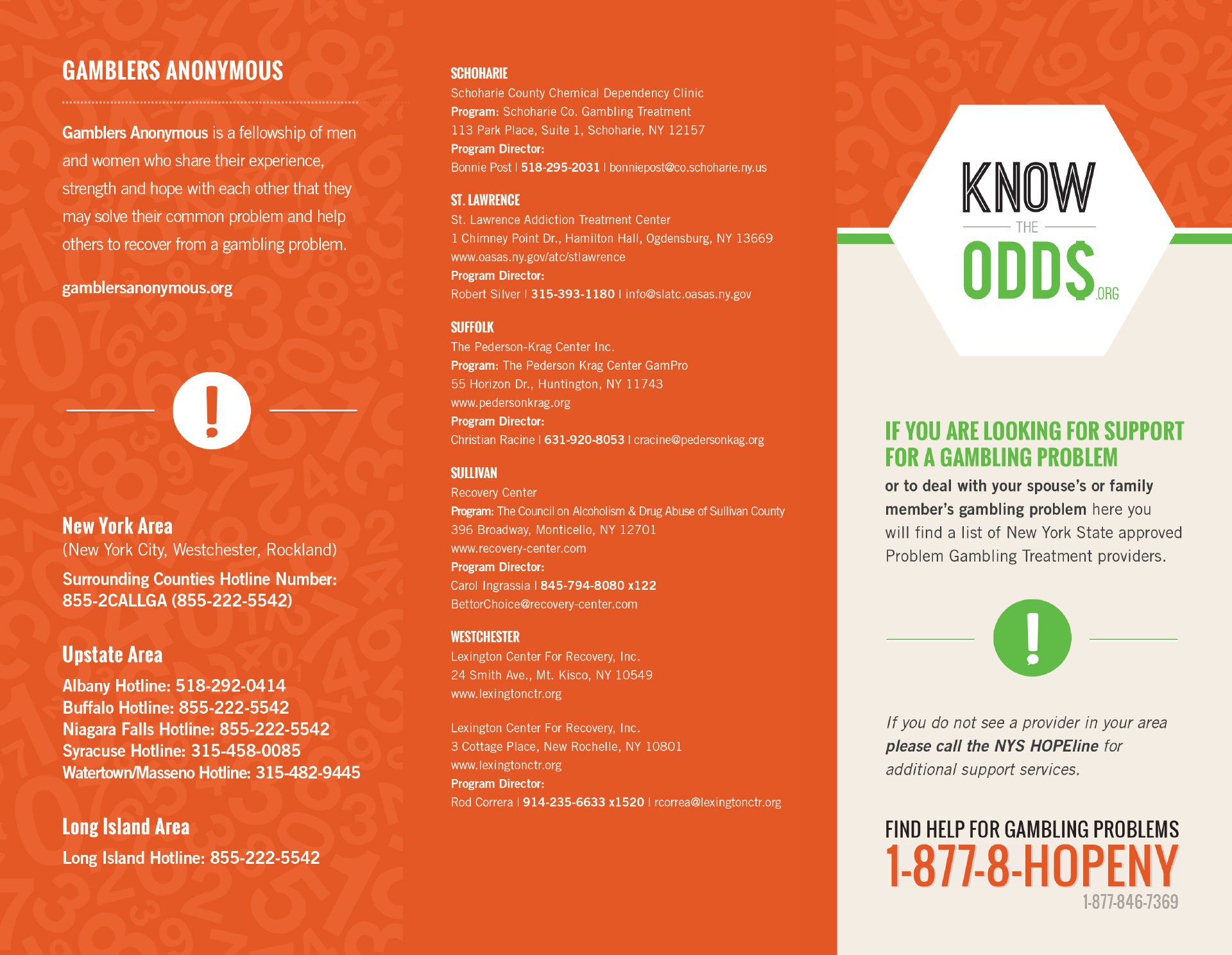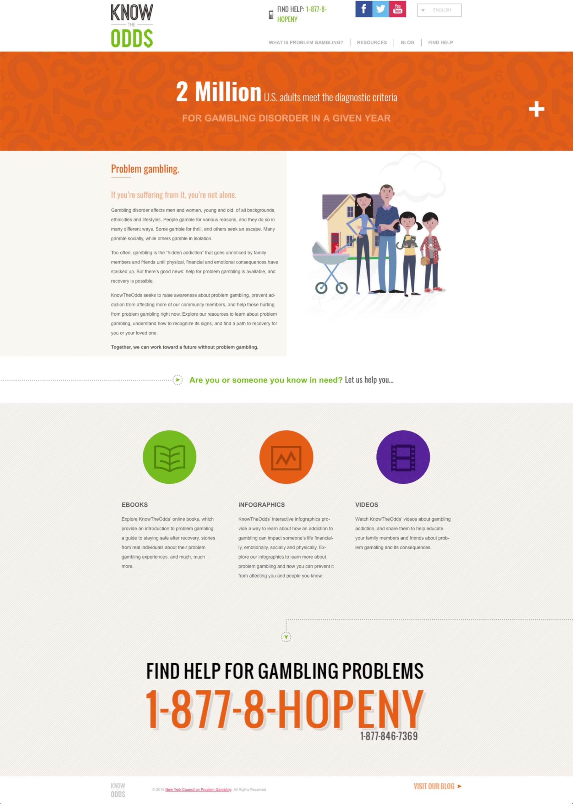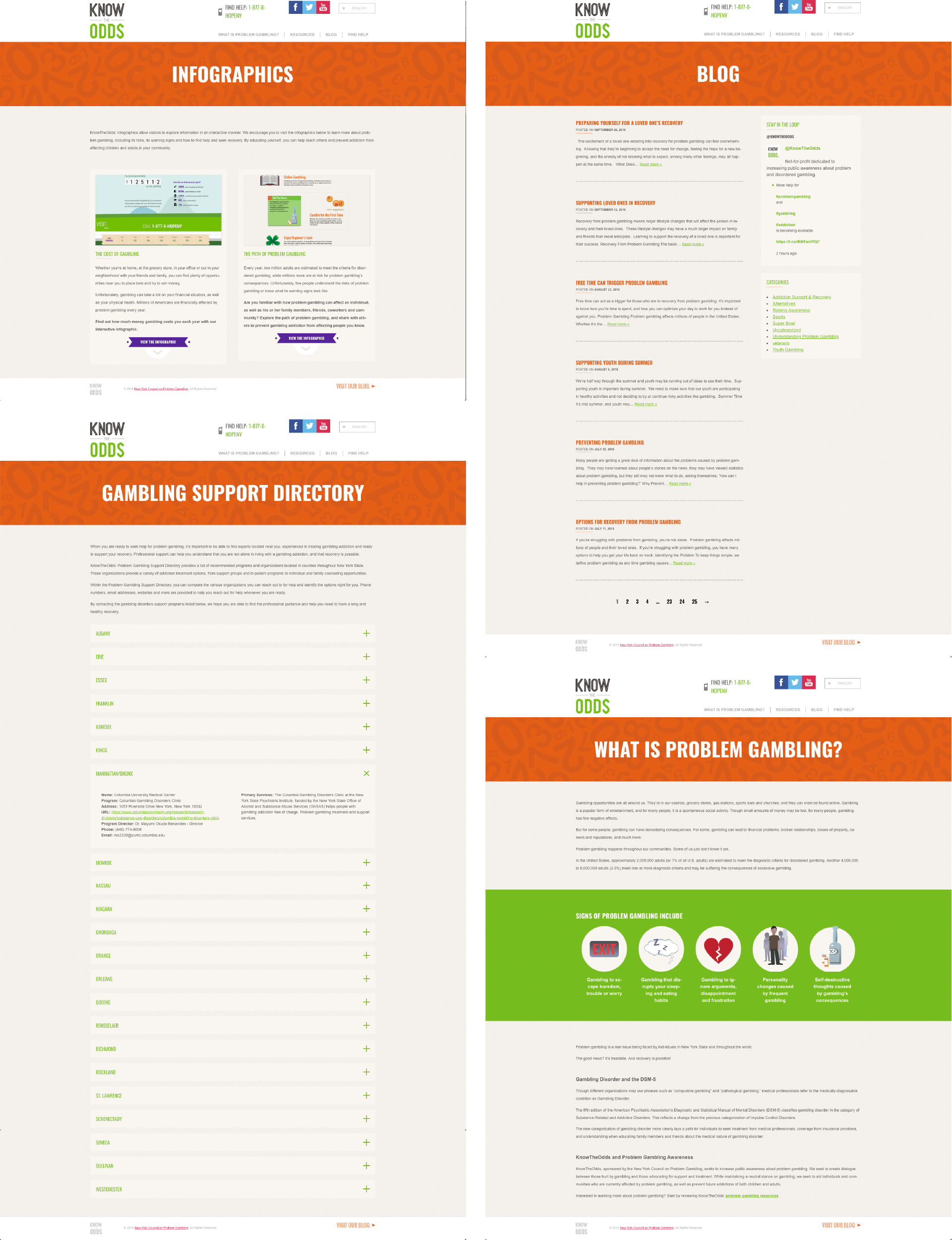 Visit KnowTheOdds.org and you will find an introduction to problem gambling, followed by a variety of resources eg: ebooks, infographics and videos. You can explore the blog for timely updates and advice, and seek help from one of the listed organizations using the gambling support directory or by calling the NYS HOPEline.